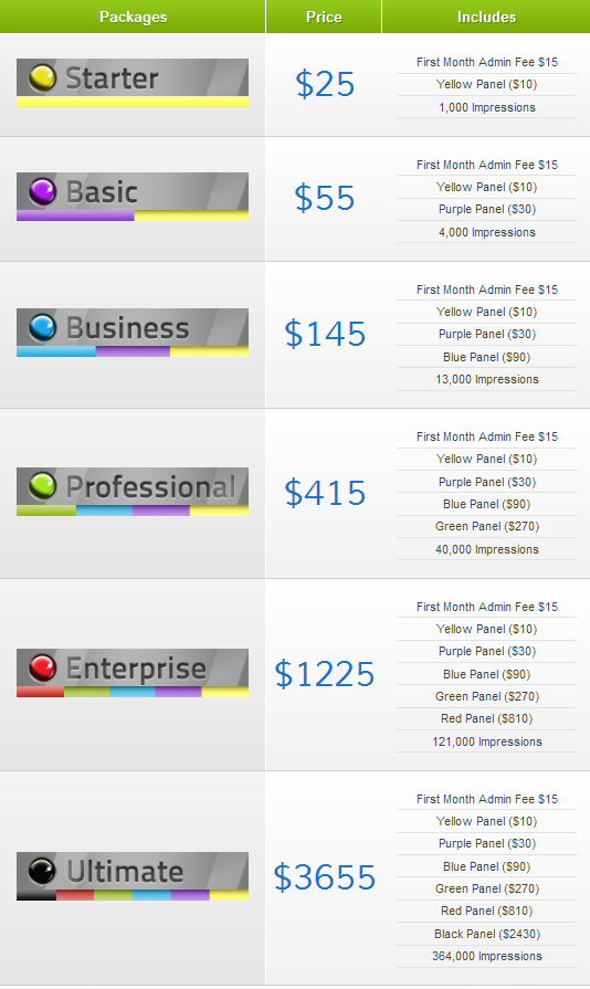Banners Broker offre 6 diversi pacchetti. Tutti hanno un colore diverso.